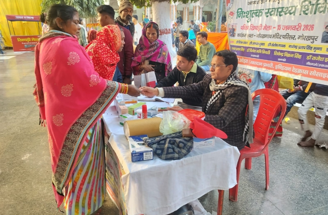 गोरखपुर पवित्र खिचड़ी मेला के अवसर पर गोरखनाथ मंदिर में इंडियन रेडक्रॉस सोसाइटी के प्रादेशिक सभापति बृजेश पाठक एवं महासचिव रामानंद कटियार के मार्गदर्शन एवं रेडक्रॉस गोरखपुर के सभापति शिवेंद्र विक्रम सिंह के निर्देशन में श्रद्धालुओं के सहायतार्थ नि:शुल्क चिकित्सा शिविर का आयोजन रक्तदान प्रभारी ज्ञानेंद्र ओझा के नेतृत्व में किया गया। शिविर में 150 से अधिक श्रद्धालुओं को प्राथमिक उपचार एवं आवश्यक दवाएं देकर एवं रुई पट्टी बांधकर सेवा किया गया।रेडक्रॉस द्वारा लगाए गए शिविर पर श्रद्धालुओं की भीड़ के बीच मुख्य चिकित्सा अधिकारी डॉ राजेश झा एवं रेडक्रॉस के उपसभापति डॉ दिनेश मणि त्रिपाठी ने पहुंचकर सेवा कार्य कर रहे आजीवन सदस्य गणों का उत्साहवर्धन किया। आज के शिविर में रक्तदान प्रभारी ज्ञानेंद्र ओझा के साथ आजीवन सदस्य संगीता राय,अखिलेश कुमार,शिवेंद्र प्रताप उपाध्याय, पुष्पराज दुबे,अनंत कुमार त्रिपाठी,आदित्य निगम,विनोद कुमार राय सहित आदि ने श्रद्धालुओं को सहयोग प्रदान किया।उक्त जानकारी पंकज पाण्डेय मीडिया प्रभारी इंडियन रेड क्रॉस गोरखपुर ने दी।