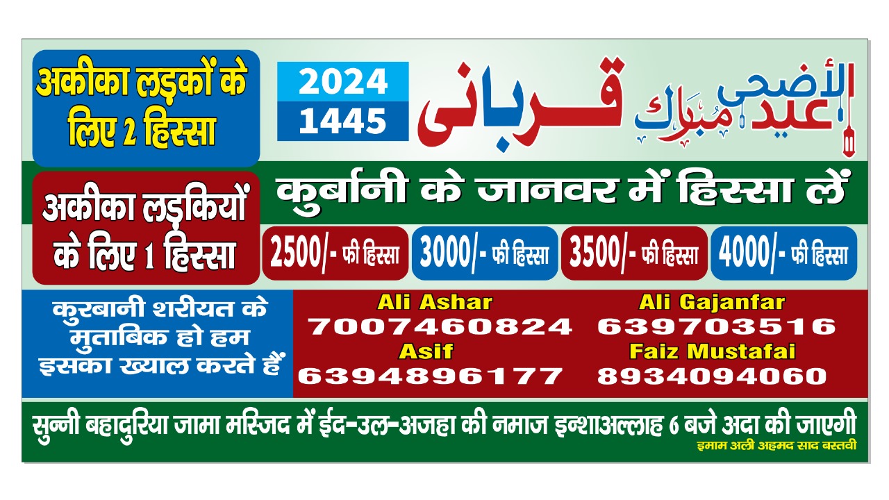 रहमतनगर के अली गज़नफर शाह, अली अशहर, आसिफ व फैज मुस्तफाई ने बताया कि हर साल की तरह इस साल भी बड़े जानवर में प्रत्येक हिस्से के एवज में 2500, 3000, 3500 व 4000 रुपया लिया जा रहा है। कुर्बानी शरीअत के मुताबिक होगी। लोग कुर्बानी में अकीका भी करवा सकते हैं। मदरसा दारूल उलूम हुसैनिया दीवान बाजार के प्रधानाचार्य हाफिज नज़रे आलम कादरी ने बताया कि मदरसे में बड़े जानवर की कुर्बानी होगी। ईद-उल-अजहा की नमाज़ भी अदा की जाएगी। उन्होंने बताया कि जो लोग बड़े जानवर की कुर्बानी में हिस्सा लेना चाहते हैं वह मदरसे से संपर्क कर पेशगी की रकम 3500 रुपया प्रत्येक हिस्से के हिसाब से जमा करा सकते हैं। वहीं अशरफी जामा मस्जिद हुमायूंपुर उत्तरी के इमाम मौलाना अली अहमद बरकाती भी बड़े जानवर की कुर्बानी में प्रत्येक हिस्से के एवज में 3000 रुपया बतोर पेशगी जमा कर रहे हैं।