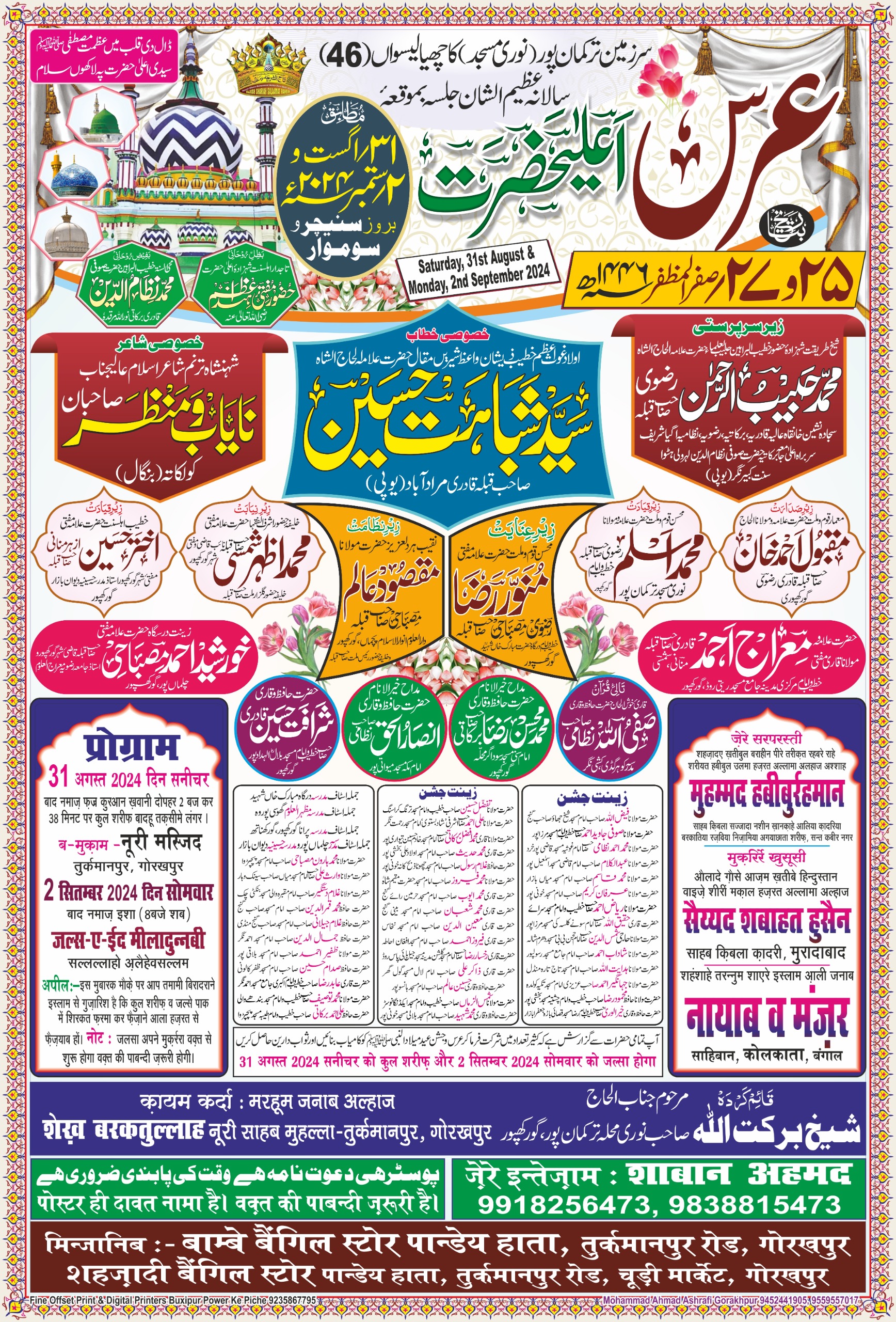 गोरखपुर। आला हज़रत इमाम अहमद रज़ा खां अलैहिर्रहमा की याद में नूरी मस्जिद तुर्कमानपुर के निकट सोमवार 2 सितंबर को रात 8:30 बजे से 46वां सालाना जलसा आयोजित किया जाएगा। यह जानकारी जलसा संयोजक शाबान अहमद व अलाउद्दीन निजामी ने दी है। मुख्य अतिथि मुरादाबाद के मशहूर धर्मगुरु अल्लामा सैयद शबाहत हुसैन कादरी अवाम को संबोधित करेंगे। अध्यक्षता पीरे तरीकत मो. हबीबुर्रहमान रज़वी व संचालन मौलाना मकसूद आलम मिस्बाही करेंगे। नात व मनकबत कोलकाता के नायाब व मंज़र पेश करेंगे। जलसे में शहर की मस्जिद व मदरसे के उलमा किराम भी शिरकत करेंगे।